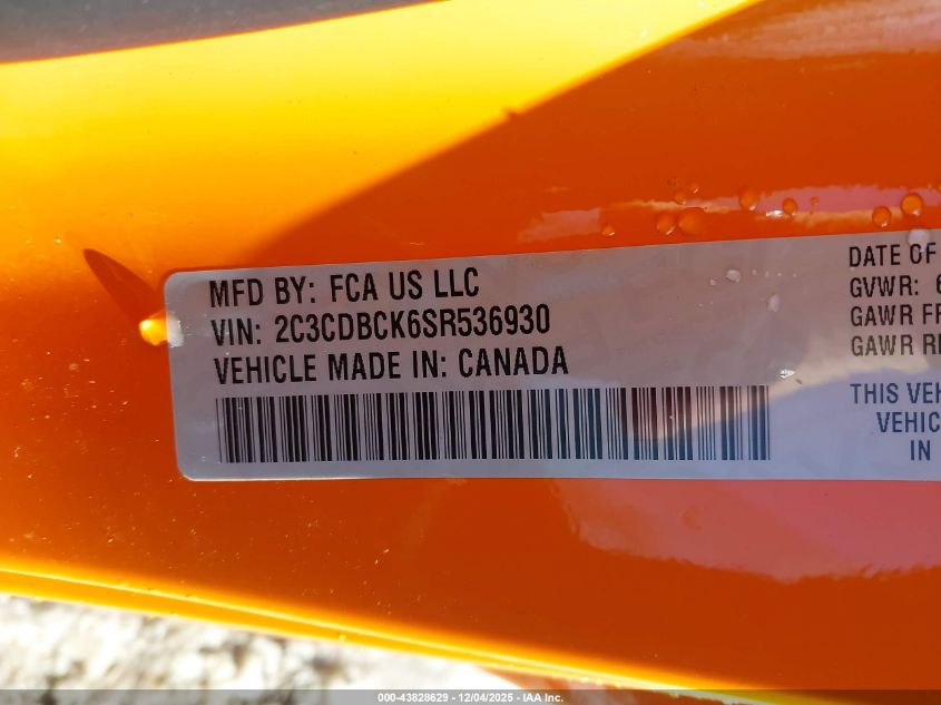 Цвет АпельсиновыйПривод Полный приводVIN 2C3CDBCK6SR536930Состояние Заводится и едет (проверено)Повреждения Передняя или задняя