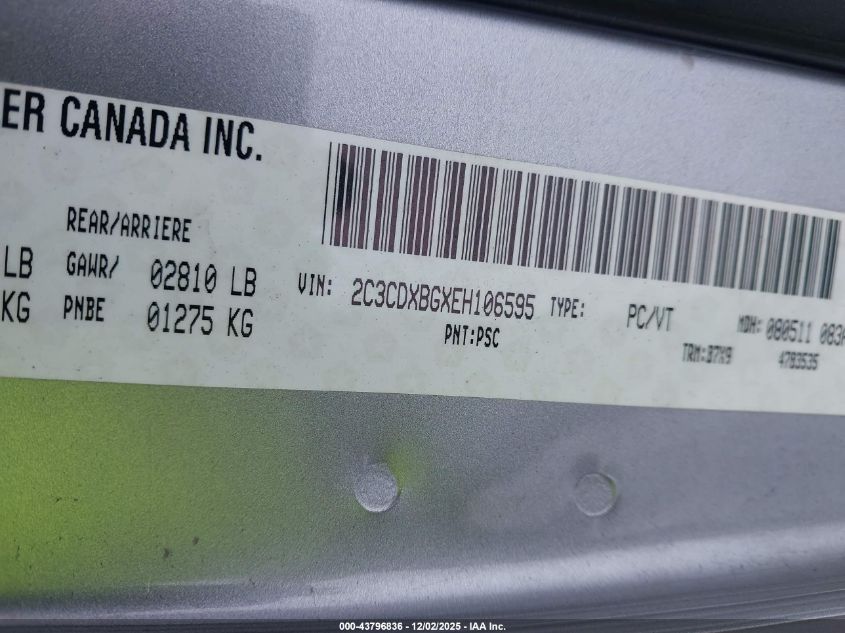 Цвет СеребряныйЦилиндры 6Привод Задний приводVIN 2C3CDXBGXEH106595Состояние Заводится и едет (проверено)Повреждения Правая сторона AutoRIA