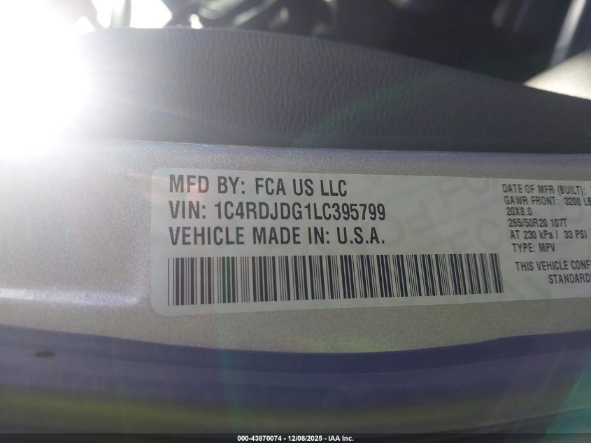 2020 DODGE DURANGO 2020 року Бензин, 3.6, Полный привод, vin - 1C4RDJDG1LC395799 из США