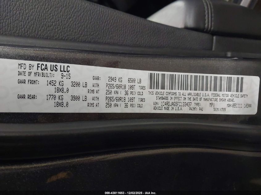 2015 DODGE DURANGO 2015 року Бензин, 3.6, Полный привод, vin - 1C4RDJAG5FC133437 из США