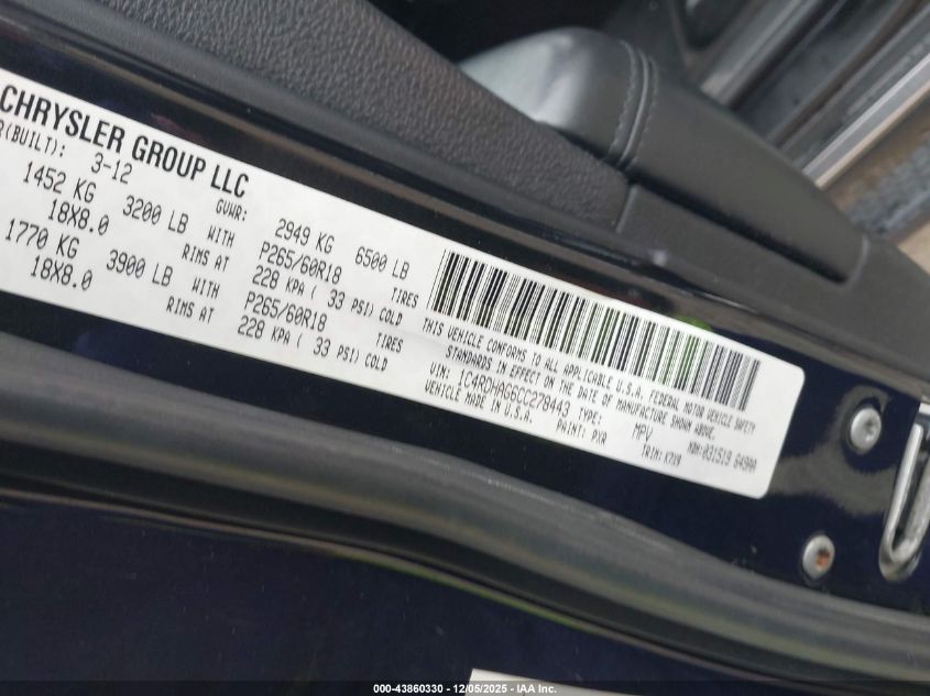 2012 DODGE DURANGO 2012 року Бензин, 3.6, , vin - 1C4RDHAG6CC278443 из США