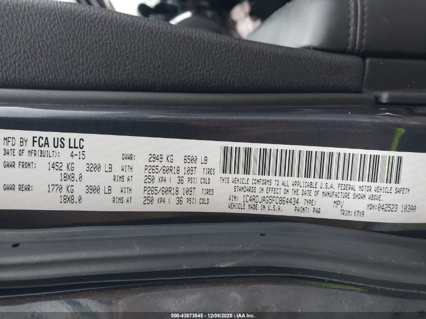 2015 DODGE DURANGO 2015 року Бензин, 3.6, Полный привод, vin - 1C4RDJAG5FC864434 из США