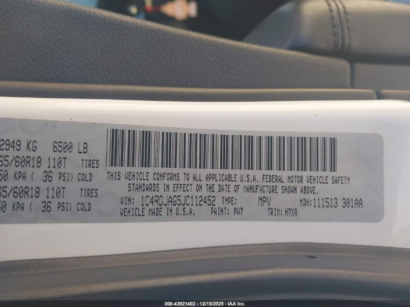 2018 DODGE DURANGO 2018 року Бензин, 3.6, Полный привод, vin - 1C4RDJAG5JC112452 из США