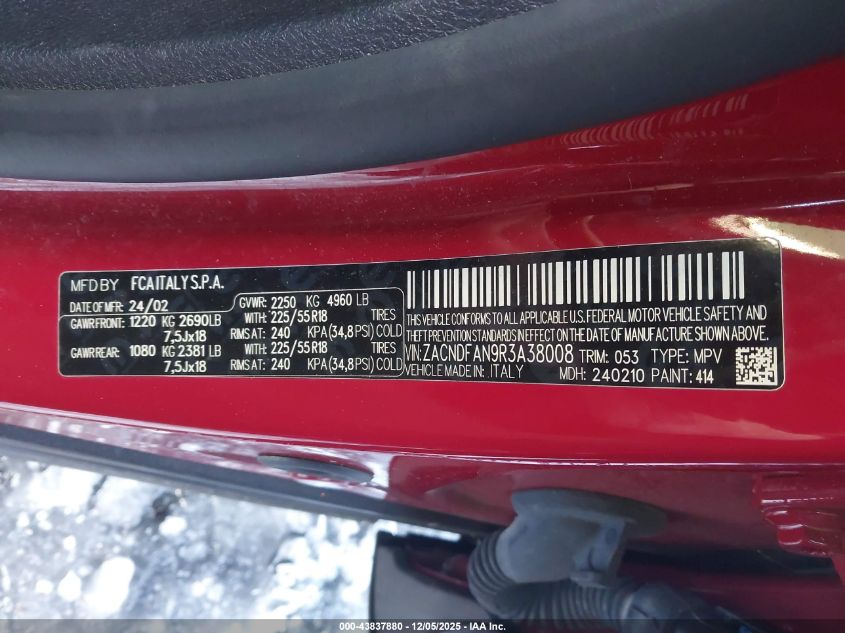 Цвет КрасныйЦилиндры 4Привод Полный приводVIN ZACNDFAN9R3A38008Состояние СтационарноПовреждения Передняя левая AutoRIA