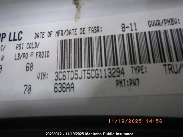Цвет БелыйЦилиндры 8Привод Полный приводVIN 3C6TD5JT5CG113294Состояние СтационарноПовреждения НеизвестноДата аукциона 2025-12-10