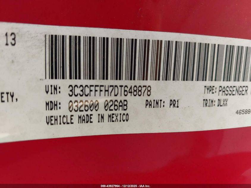 Цвет КрасныйЦилиндры 4Привод Передний приводVIN 3C3CFFFH7DT648878Состояние СтационарноПовреждения Левая сторона AutoRIA