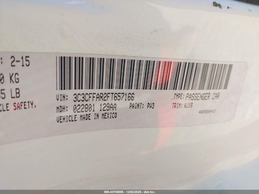 Цвет БелыйЦилиндры 4Привод Передний приводVIN 3C3CFFAR2FT657166Состояние СтационарноПовреждения Передняя или задняя AutoRIA