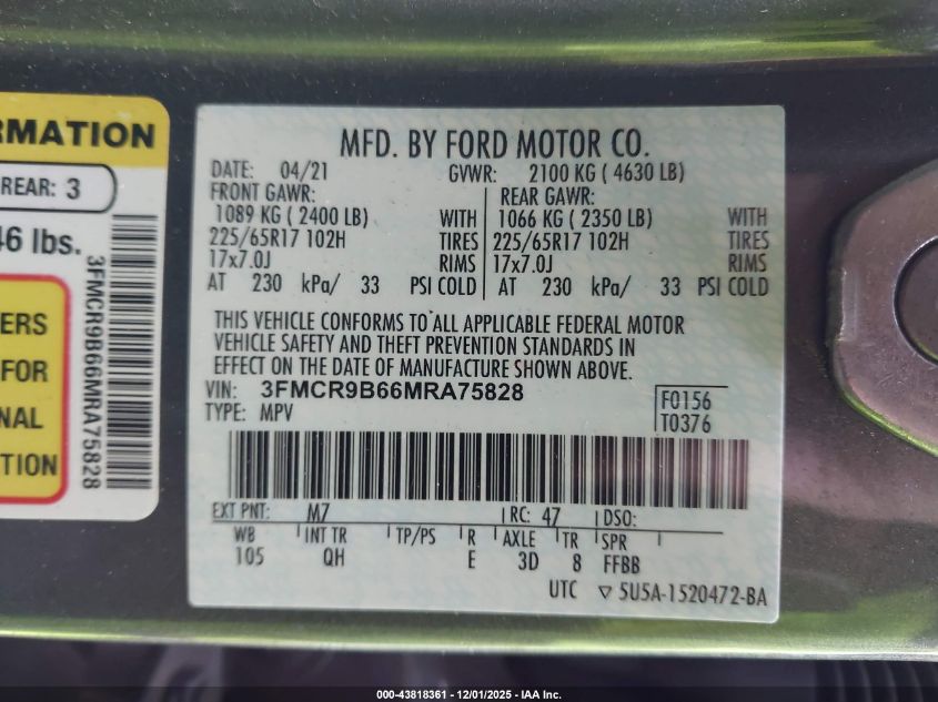 2021 FORD BRONCO SPORT 2021 року Бензин, 1.5, Полный привод, vin - 3FMCR9B66MRA75828 из США