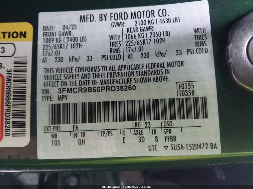 2023 FORD BRONCO SPORT 2023 року Бензин, 1.5, Полный привод, vin - 3FMCR9B66PRD38260 из США