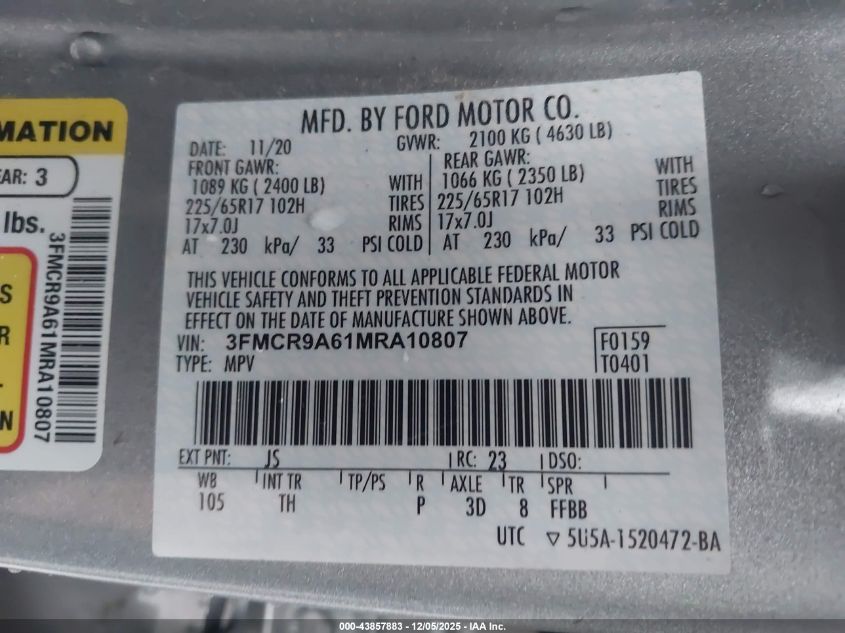 2021 FORD BRONCO SPORT 2021 року Бензин, 1.5, Полный привод, vin - 3FMCR9A61MRA10807 из США
