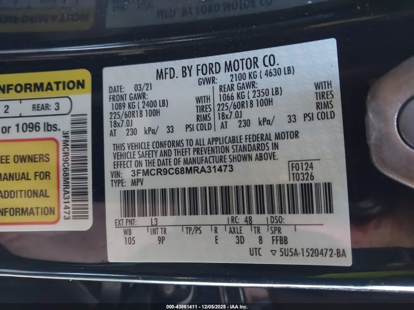 2021 FORD BRONCO SPORT 2021 року Бензин, 1.5, Полный привод, vin - 3FMCR9C68MRA31473 из США