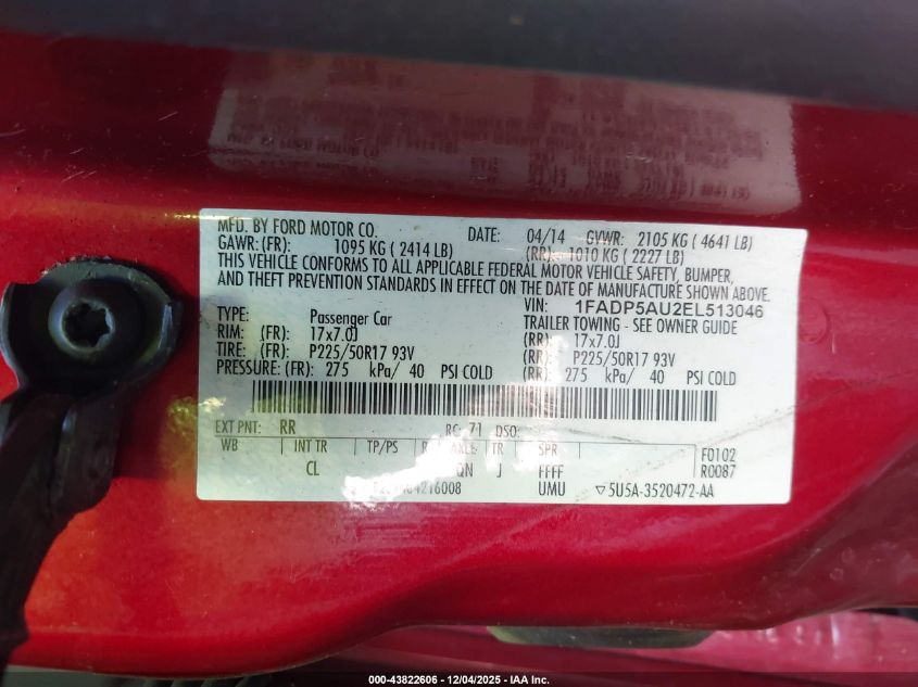 Цвет КрасныйЦилиндры 4Привод Передний приводVIN 1FADP5AU2EL513046Состояние Заводится и едет (проверено)Повреждения Правая сторона AutoRIA