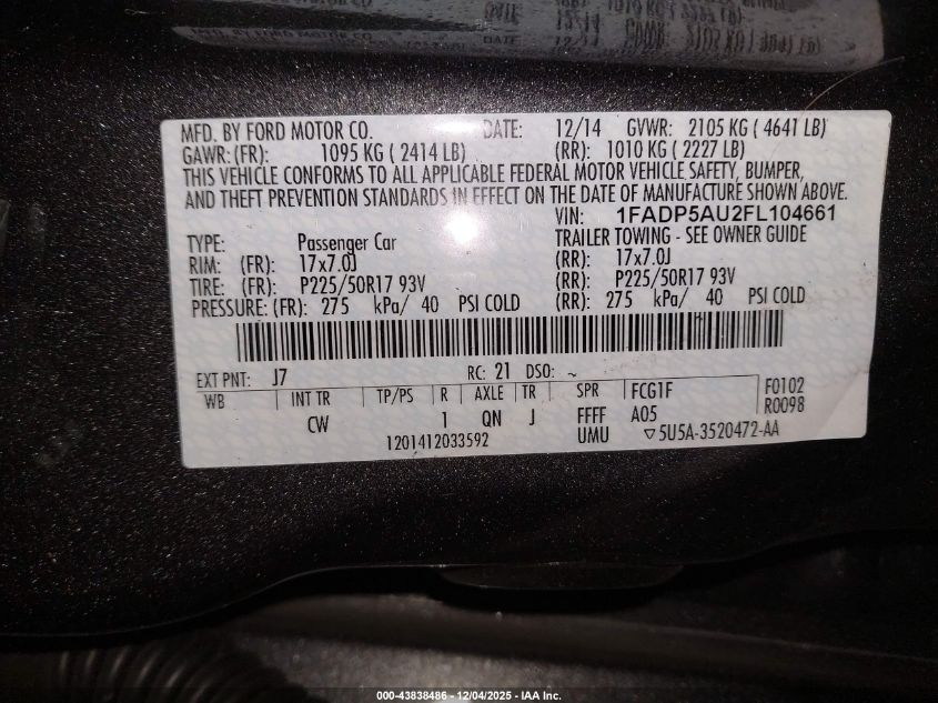 Цвет СерыйЦилиндры 4Привод Передний приводVIN 1FADP5AU2FL104661Состояние СтационарноПовреждения Передняя или задняя AutoRIA