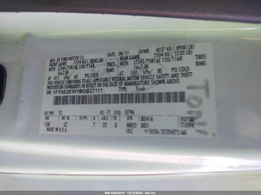 Цвет БелыйЦилиндры 8Привод Задний приводVIN 1FTNE2EW1BDB27111Состояние Заводится и едет (проверено)Повреждения Передняя или задняя