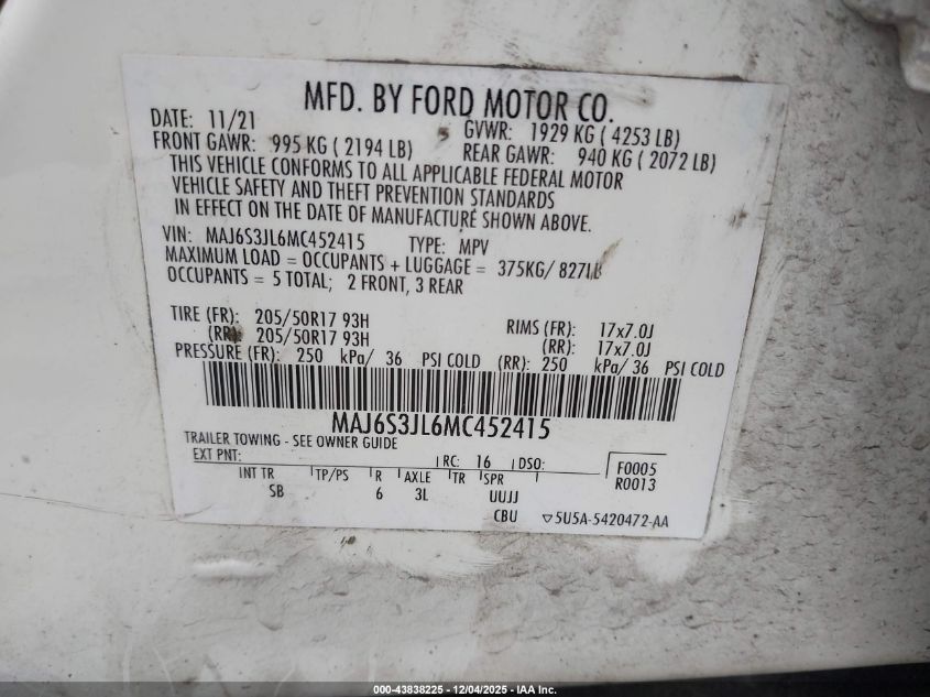 2021 FORD ECOSPORT 2021 року Бензин, 2.0, Полный привод, vin - MAJ6S3JL6MC452415 из США