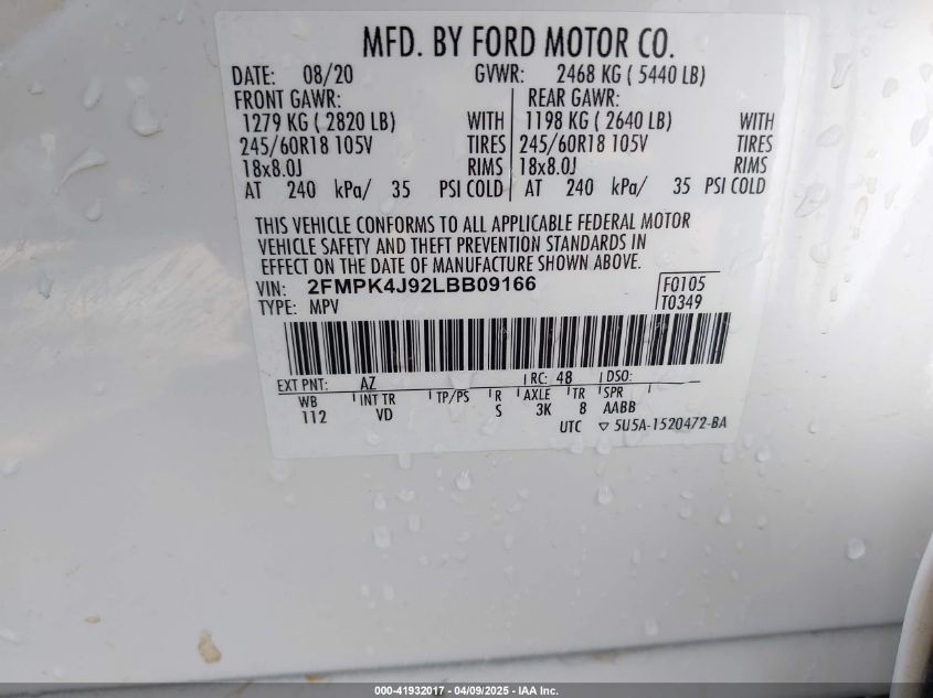2020 FORD EDGE 2020 року Бензин, 2.0, Полный привод, vin - 2FMPK4J92LBB09166 из США
