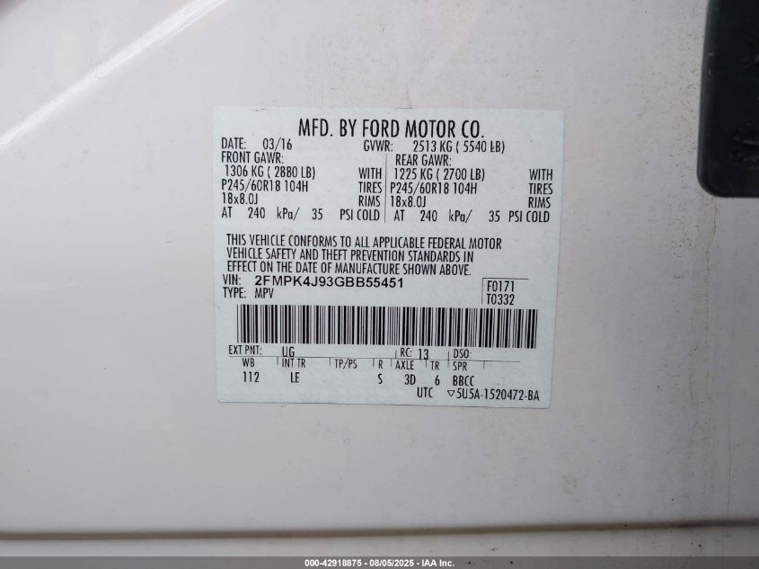 2016 FORD EDGE 2016 року Бензин, 2.0, Полный привод, vin - 2FMPK4J93GBB55451 из США
