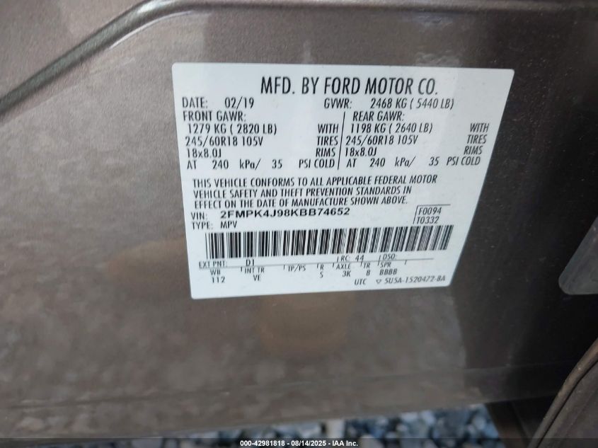 2019 FORD EDGE 2019 року Бензин, 2.0, Полный привод, vin - 2FMPK4J98KBB74652 из США
