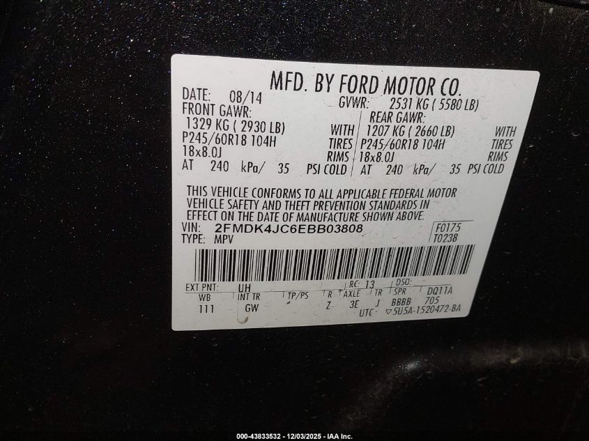 Цвет ЧерныйЦилиндры 6Привод Полный приводVIN 2FMDK4JC6EBB03808Состояние СтационарноПовреждения Механические поврежденияДата аукциона 2025-12-11 AutoRIA