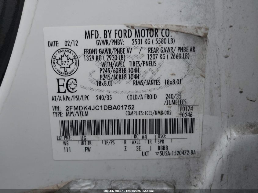 Цвет БелыйЦилиндры 6Привод Полный приводVIN 2FMDK4JC1DBA01752Состояние Заводится и едет (проверено)Повреждения Правая сторона AutoRIA