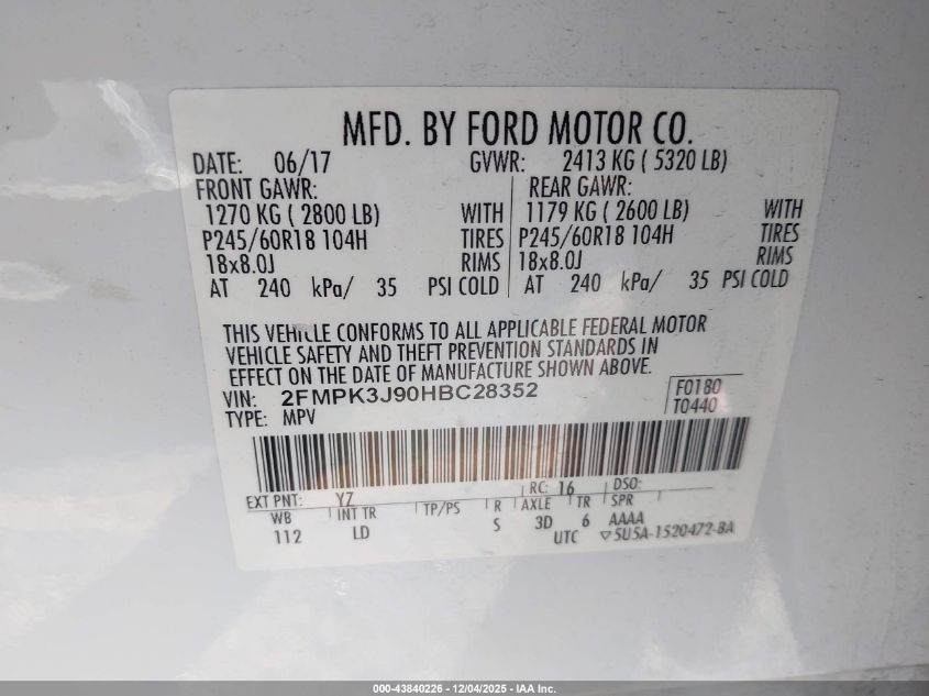 Цвет БелыйЦилиндры 4Привод Передний приводVIN 2FMPK3J90HBC28352Состояние СтационарноПовреждения Передняя или задняя AutoRIA