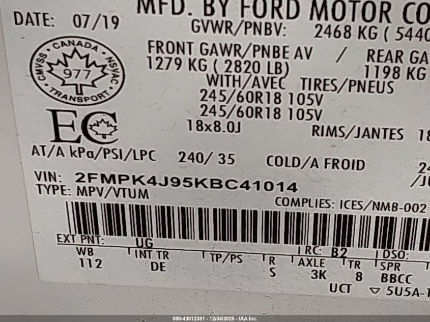 Цвет БелыйЦилиндры 4Привод Полный приводVIN 2FMPK4J95KBC41014Состояние Заводится и едет (проверено)Повреждения Левая сторона AutoRIA