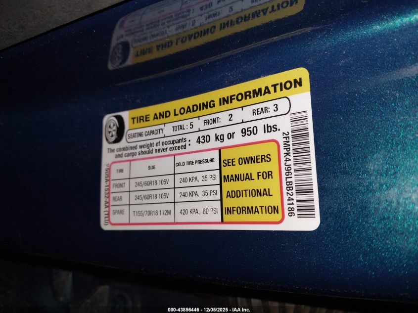 Цвет БирюзовийЦилиндры 4Привод Полный приводVIN 2FMPK4J96LBB24186Состояние СтационарноПовреждения Передняя или задняя AutoRIA