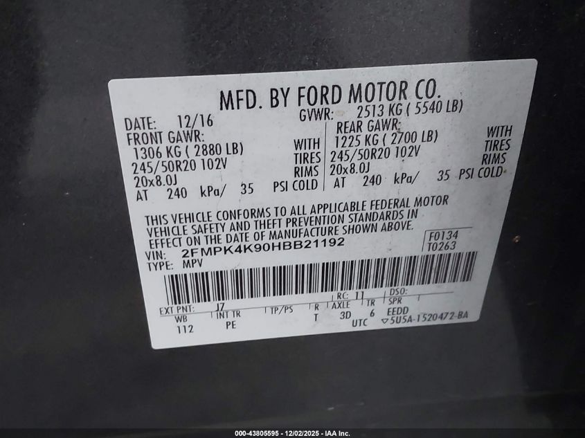 2017 FORD EDGE 2017 року Бензин, 2.0, Полный привод, vin - 2FMPK4K90HBB21192 из США