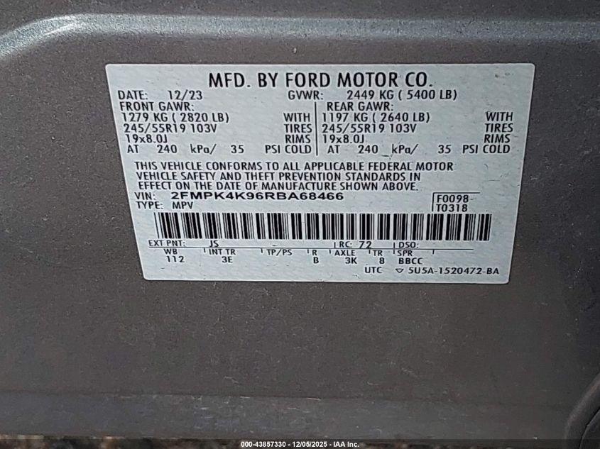 2024 FORD EDGE 2024 року Бензин, 2.0, Полный привод, vin - 2FMPK4K96RBA68466 из США