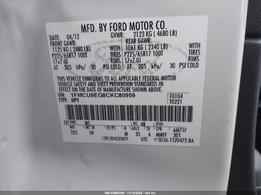 Цвет БелыйЦилиндры 6Привод Полный приводVIN 1FMCU9EG8CKC80959Состояние Заводится и едет (проверено)Повреждения Передняя или задняяДата аукциона 2025-12-09 AutoRIA