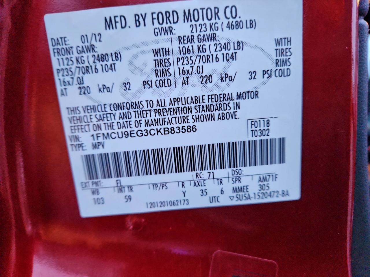 Цвет БургундияЦилиндры 6Привод Полный приводVIN 1FMCU9EG3CKB83586Состояние Заводится и едет (проверено)Повреждения Задняя AutoRIA