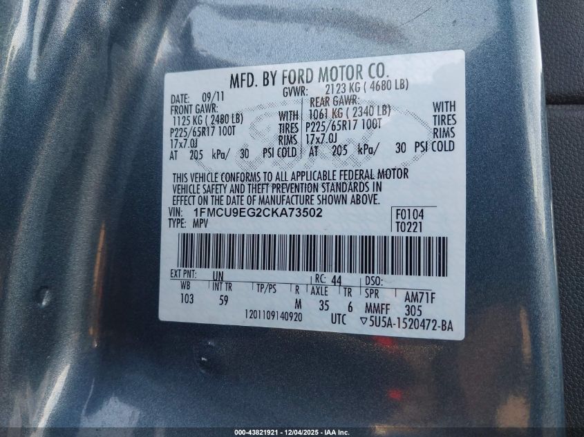 2012 FORD ESCAPE 2012 року Бензин, 3.0, Полный привод, vin - 1FMCU9EG2CKA73502 из США
