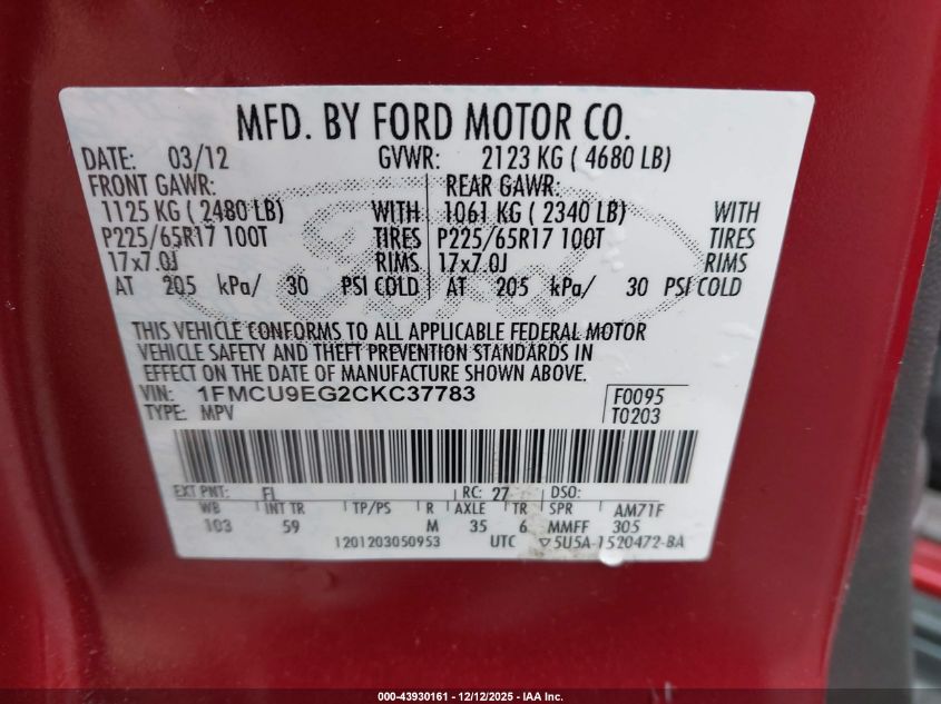 Цвет КрасныйЦилиндры 6Привод Полный приводVIN 1FMCU9EG2CKC37783Состояние Заводится и едет (проверено)Повреждения Передняя левая AutoRIA