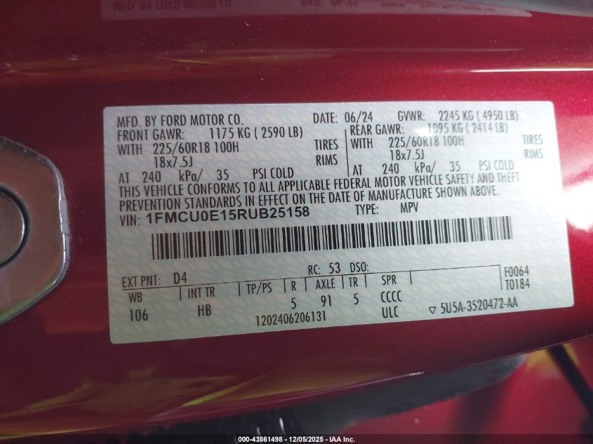 2024 FORD ESCAPE 2024 року Гибрид, 2.5, Передний привод, vin - 1FMCU0E15RUB25158 из США