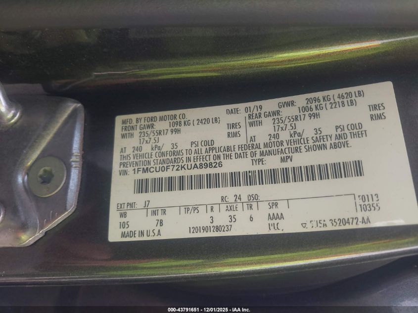 Цвет СерыйЦилиндры 4Привод Передний приводVIN 1FMCU0F72KUA89826Состояние СтационарноПовреждения Передняя или задняя AutoRIA