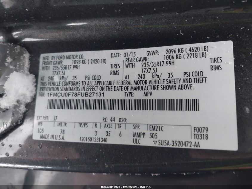 2015 FORD ESCAPE 2015 року Бензин, 2.5, Передний привод, vin - 1FMCU0F78FUB27131 из США