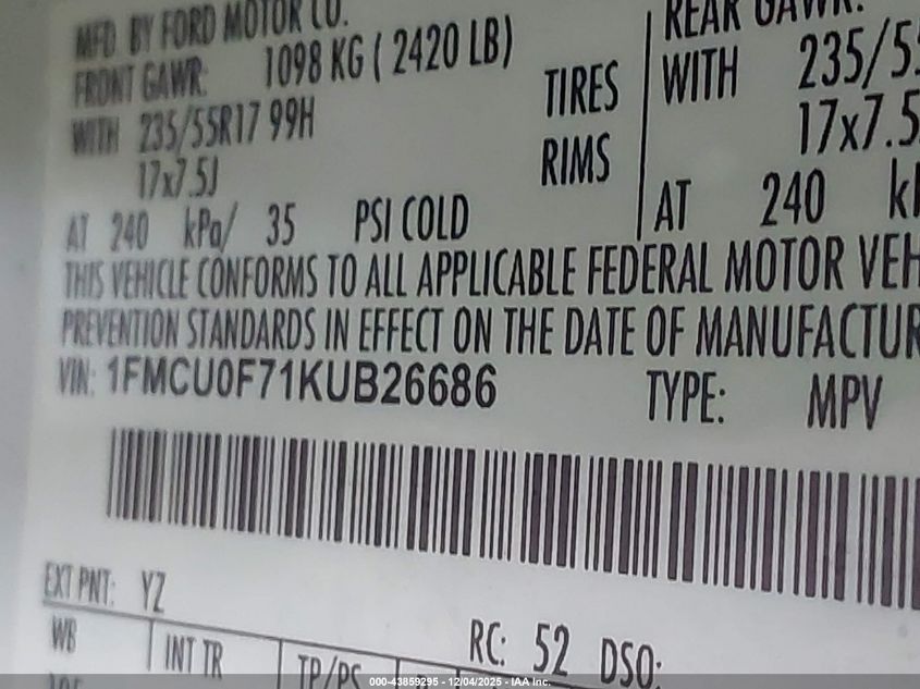 Цвет БелыйЦилиндры 4Привод Передний приводVIN 1FMCU0F71KUB26686Состояние СтационарноПовреждения Передняя или задняя AutoRIA