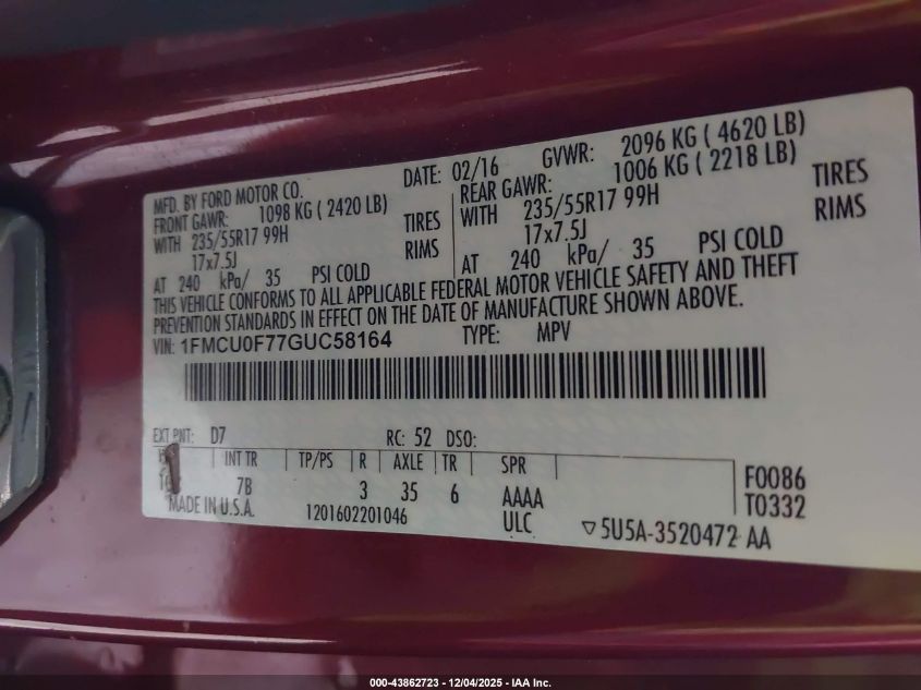 Цвет АпельсиновыйЦилиндры 4Привод Передний приводVIN 1FMCU0F77GUC58164Состояние Заводится и едет (проверено)Повреждения Передняя или задняя AutoRIA