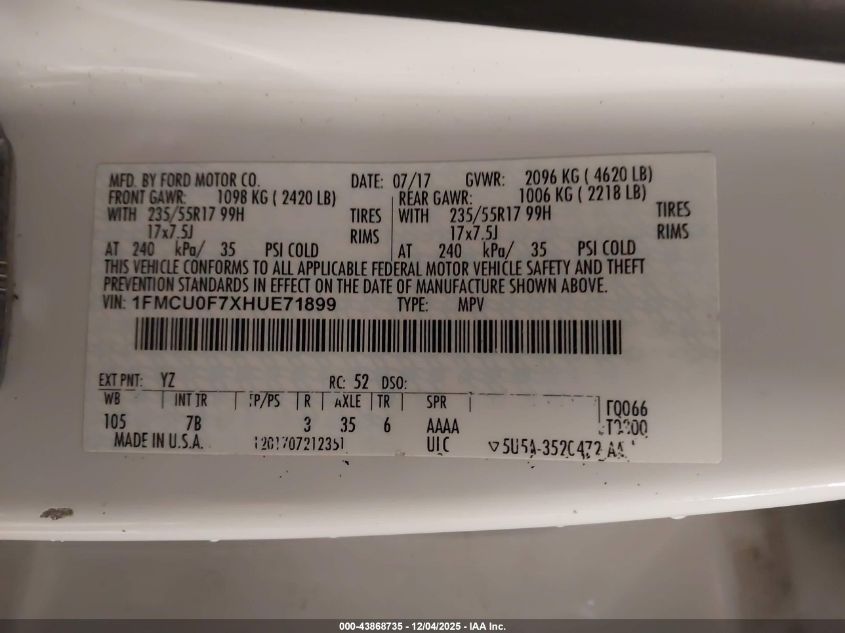 Цвет БелыйЦилиндры 4Привод Передний приводVIN 1FMCU0F7XHUE71899Состояние Заводится и едет (проверено)Повреждения Левая сторона AutoRIA