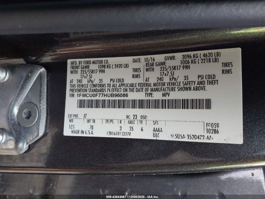 2017 FORD ESCAPE 2017 року Бензин, 2.5, Передний привод, vin - 1FMCU0F77HUB96086 из США