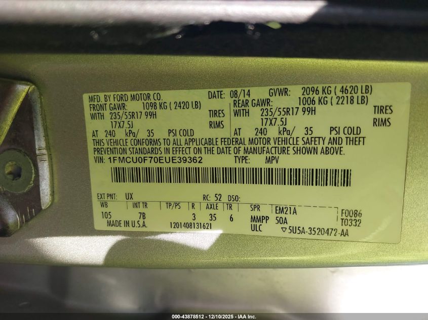 2014 FORD ESCAPE 2014 року Бензин, 2.5, Передний привод, vin - 1FMCU0F70EUE39362 из США