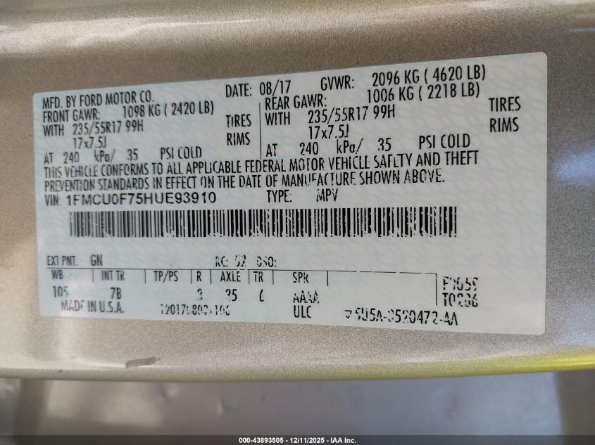 2017 FORD ESCAPE 2017 року Бензин, 2.5, Передний привод, vin - 1FMCU0F75HUE93910 из США