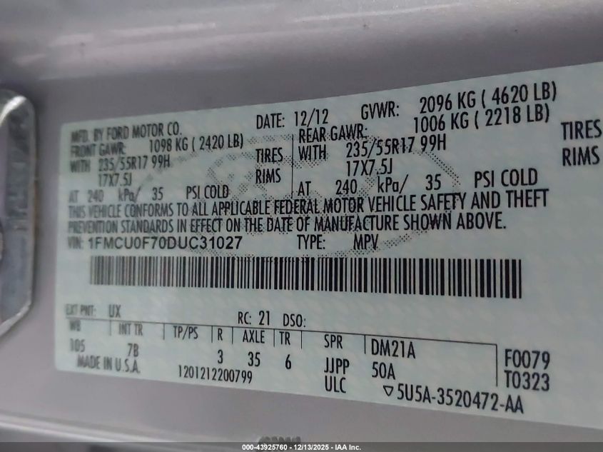 Цвет СинийЦилиндры 4Привод Передний приводVIN 1FMCU0F70DUC31027Состояние Заводится и едет (проверено)Повреждения Задняя AutoRIA
