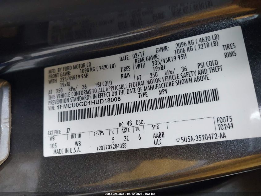 Цвет СерыйЦилиндры 4Привод Передний приводVIN 1FMCU0GD1HUD18008Состояние СтационарноПовреждения Передняя или задняяДата аукциона 2025-12-18 AutoRIA