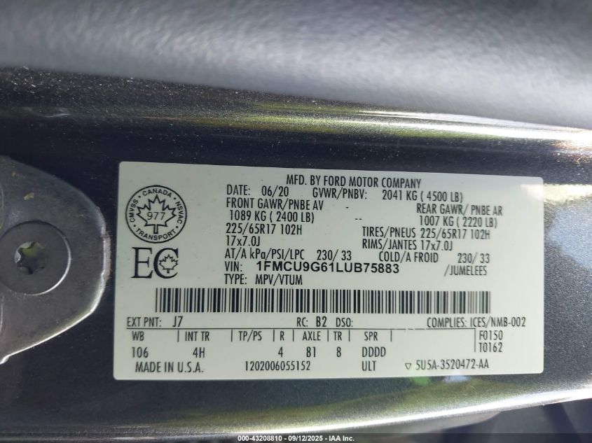 2020 FORD ESCAPE 2020 року Бензин, 1.5, Полный привод, vin - 1FMCU9G61LUB75883 из США