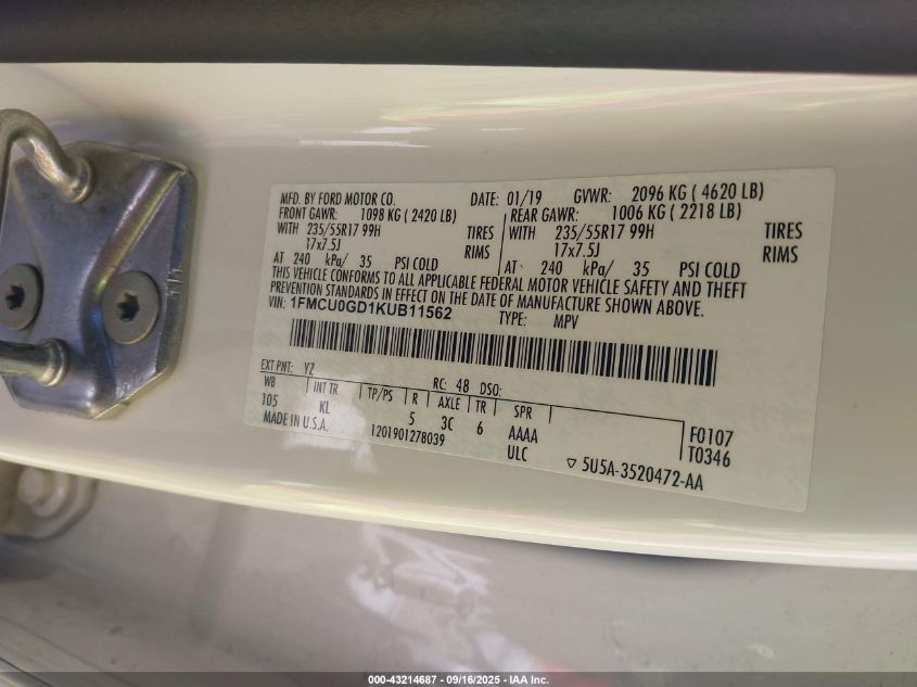 Цвет БелыйЦилиндры 4Привод Передний приводVIN 1FMCU0GD1KUB11562Состояние Заводится и едет (проверено)Повреждения Передняя праваяДата аукциона 2025-12-16 AutoRIA