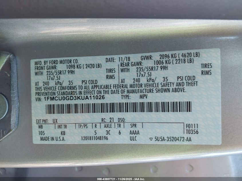 Цвет СеребряныйЦилиндры 4Привод Передний приводVIN 1FMCU0GD3KUA11026Состояние Заводится и едет (проверено)Повреждения Передняя леваяДата аукциона 2025-12-10 AutoRIA