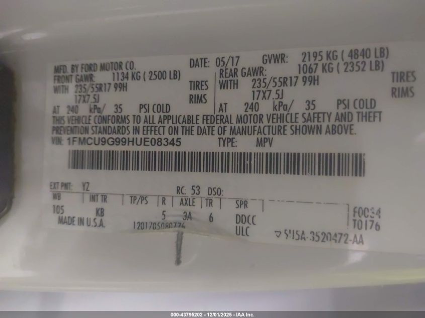 2017 FORD ESCAPE 2017 року Бензин, 2.0, Полный привод, vin - 1FMCU9G99HUE08345 из США