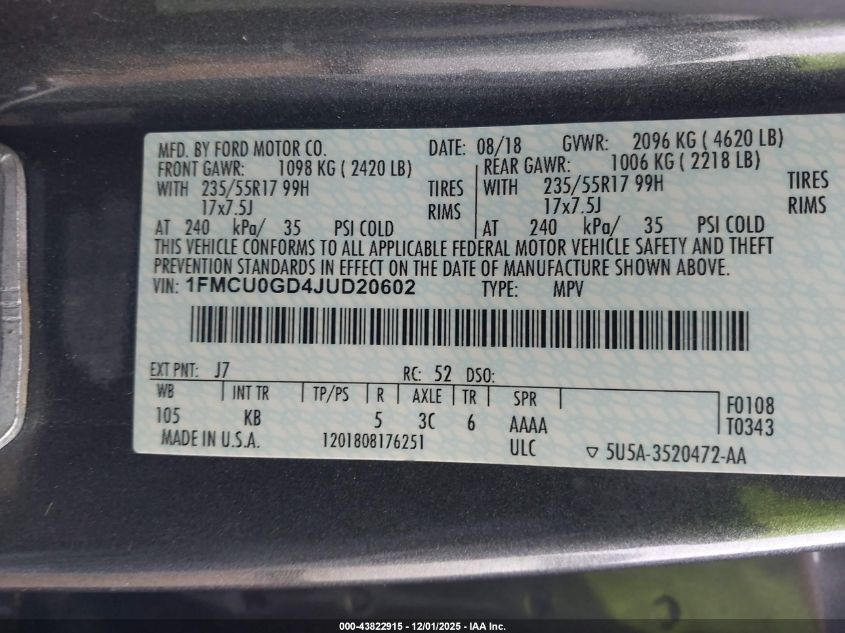 Цвет СерыйЦилиндры 4Привод Передний приводVIN 1FMCU0GD4JUD20602Состояние СтационарноПовреждения Передняя левая AutoRIA