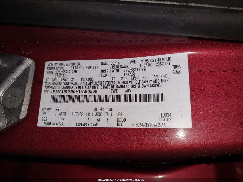 2017 FORD ESCAPE 2017 року Бензин, 2.0, Полный привод, vin - 1FMCU9G90HUA90566 из США